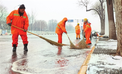 南开区环卫工人清雪推水。 本报记者 胡凌云 通讯员 石乔 刘峥 摄