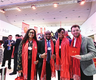 1月16日,在瑞士达沃斯,与会者在“大连之夜”招待会上合影。 新华社发