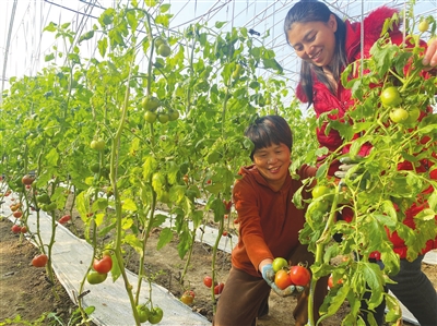 欢坨村西红柿种植基地,董志梅(左)在自家暖棚内帮客户采摘西红柿。