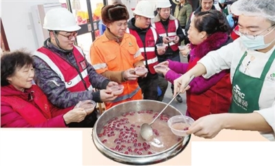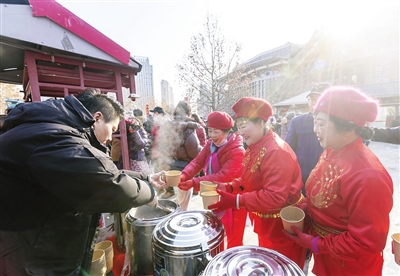 昨日,天津古文化街举办民俗活动,并请游客免费品尝腊八粥。 本报记者 胡凌云 通讯员 王英浩 刘顺利 摄