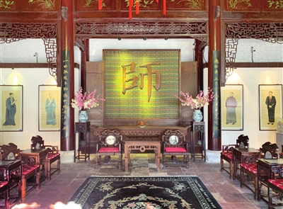广东会馆四合院正厅原是广东人祭祀祖先的地方,后为繁荣中国戏曲行业,弘扬华夏尊师之美德,这里建立了国内首座梨园拜师堂,并供奉先师、集列百戏,以为众览。2000年10月梨园拜师堂对外开放,为梨园界提供一个中国戏曲艺术薪火相传的场所。“迎面木雕为颜体‘师’字,师为长者授业,承为学者习艺,师承为历史进步之根基。先辈艺术家课徒授艺,传承发展,薪尽火传,中国戏曲艺术绵延流传,博大精深,成为中华艺术之精粹。在拜师堂东、西两侧陈列有《中国戏曲剧种名录》共计366个剧种,全国游客来到这里可以追根溯源,寻找自己家乡的剧种。”何川说。