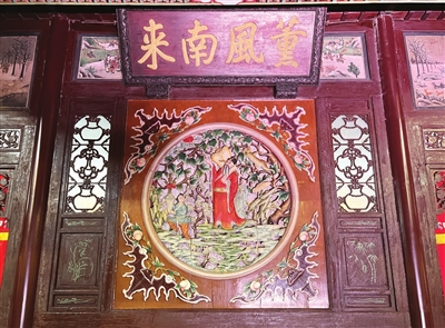 据何川介绍,在广东会馆内有两处“镇馆之宝”,一处是大戏楼舞台正中的巨幅彩色镂空木雕“天官赐福图”,作为馆内唯一的彩色镂空木雕,其雕刻精美、寓意丰富,是十分珍贵的历史文物;另一处则是会馆四合院拜师堂东山墙上方的立体砖雕,是馆内现存最完整、最精美的原始砖雕,蟠龙砖雕有镇宅辟火之寓意,牡丹砖雕则代表吉祥、美好、平安之寓意。