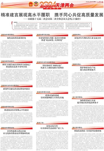 政协全体会议大会发言是人民政协参加单位、政协委员履行职能,发挥人民政协专门协商机构作用的一种重要形式。在市政协十五届二次会议大会发言中,委员们坚持以习近平新时代中国特色社会主义思想为指导,深入学习贯彻中共二十大和二十届二中全会精神,全面落实市委十二届四次全会暨市委经济工作会议部署,聚焦推动高质量发展“十项行动”建睿智之言,围绕民之关切献务实之策,体现了饱满的政治热情、昂扬的精神状态和为国履职、为民尽责的时代担当,为推进中国式现代化的天津实践贡献了智慧和力量。本期大会专版予以摘登。