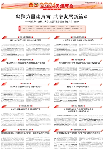 市政协十五届二次会议期间,市委、市政府主要领导同志看望出席会议的市政协委员,并参加界别联组讨论,与委员共商天津发展大计。委员们围绕加快科技创新产业创新深度融合、深入推进港产城融合等事关我市高质量发展的重点难点问题精准建言,体现了积极进取的奋斗精神和对城市发展的责任担当。本期大会专版予以摘登。