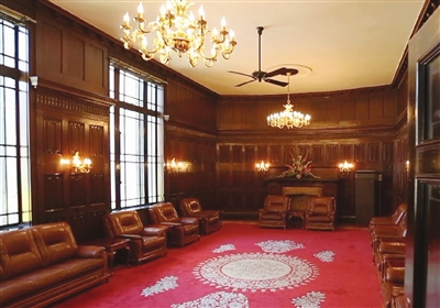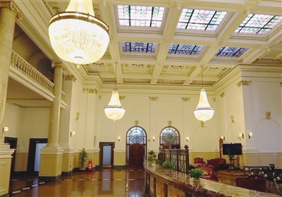 走进原横滨正金银行大楼,可看到营业大厅二层的开敞连廊采用爱奥尼式圆柱支撑,栏杆为宝瓶列柱,连廊顶做成拱券。楼梯地面为海运而来的大理石,色泽光润,纹理细腻。房间的室内装饰多用木雕护墙板,屋顶金色灯饰造型优美,彰显奢华之气。(节选,有改动)