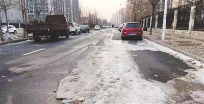哲明幼儿园位于旌智道东头,附近万科、蓝庭等小区居民大都选择将孩子送入这家幼儿园。记者曾到现场,发现幼儿园门前的旌智道上,大约100米长的路面两侧结有很长的冰带,厚度约10厘米。冰带将非机动车道占满,非机动车和机动车在路中间抢道并行,存在诸多隐患。