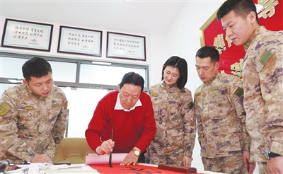 为不断丰富部队官兵业余文化生活,弘扬传统书画艺术,日前,南开区双拥办邀请岩柏书画院,走进驻区部队举办“墨香迎新年、送福进军营”慰问活动,共同迎接新春佳节。