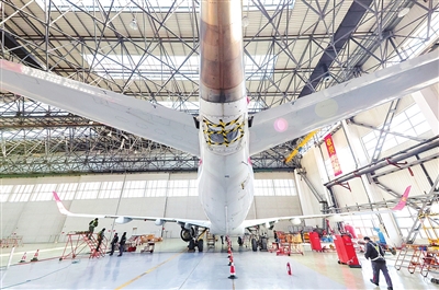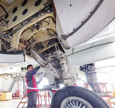 相较于汽车,飞机“保养”除工序复杂很多之外,选择什么时间保养也有特别之处。“飞机定检时间需要科学统筹安排,既要保证飞机状况良好,又要实现效益最大化。航空公司一般会将定检计划集中安排在出行高峰期之前,去年一进入12月,我们就忙起来了。春运、暑运等旺季到来前,机库里经常停满飞机。机务人员也会根据需要倒班作业,尽早释放运力,让飞机尽量飞在天上产生效益。”胡记超解释。