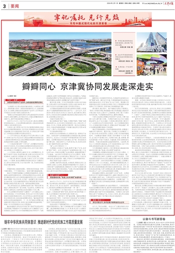 肩负新使命,澎湃新动能。天津把推进京津冀协同发展作为重大政治责任和重大战略机遇,立足“一基地三区”功能定位,自觉从全局谋划一域、以一域服务全局,以推动京津冀协同发展走深走实行动为龙头,部署实施高质量发展“十项行动”,为使京津冀成为“中国式现代化建设的先行区、示范区”展现天津作为、贡献天津力量。