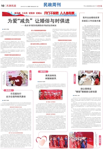 “北辰区将以此为试点,把婚俗改革推向深入。新人来这里领证,可以在公园户外场地免费拍照。我们还将邀请民俗专家、婚姻法律顾问等相关专业人士到场,开展主题宣传活动,向新人推广节俭办婚礼理念。”北辰区民政局社会事务管理科科长宋宏伟说。