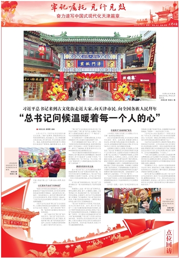 2月1日下午,习近平总书记来到天津古文化街,了解产品种类、销售和传统文化传承发展等情况,同店铺业主、员工和现场群众互动交流,向天津市民、向全国各族人民拜年。他说,各级党委和政府要加强节日期间民生商品的产销保供,确保数量充足、品类丰富、质量可靠,让广大群众放心消费、快乐过年。