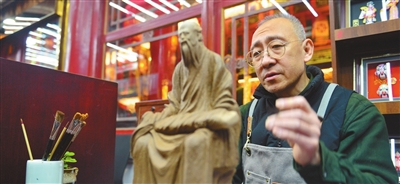 在“泥人张”世家的展示区,“泥人张”工作者刘强正在一张木桌旁修复《孔子抚琴》泥塑作品。