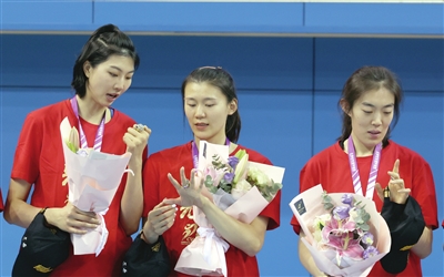 袁心玥(左)王艺竹(中)孟豆展示冠军戒指