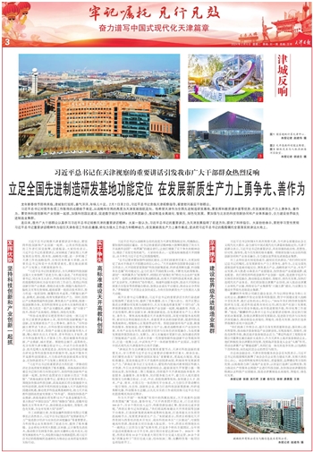 连日来,我市广大干部群众认真学习习近平总书记视察天津的重要讲话精神。大家一致认为,习近平总书记的重要讲话,为天津发展指明了前进方向,提供了科学指引。大家纷纷表示,要把学习宣传贯彻习近平总书记重要讲话精神作为指引天津各项工作的总遵循,转化为强大工作动力和精神动力,在发展新质生产力上善作善成,坚决把习近平总书记的殷殷嘱托全面落实到津沽大地上。