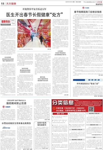 春节将至,我市医学专家带来了新春健康祝福,祝愿大家从现在开始,坚持合理膳食,经常运动,保持理想体重,不吸烟,少饮酒,控制好血压、血糖和血脂,龙年人人都是健康“达人”。专家们还根据往年春节期间医院急诊经验,开出了健康过年“处方”,建议市民过节有度,饮食有限,生活有节,出游有备,平安喜乐过春节。
