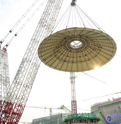 图为“玲龙一号”外穹顶在进行吊装作业。