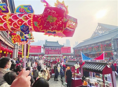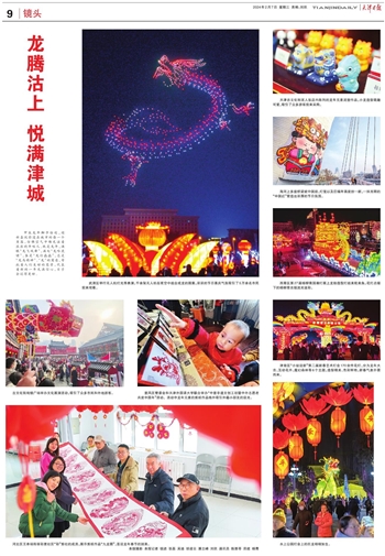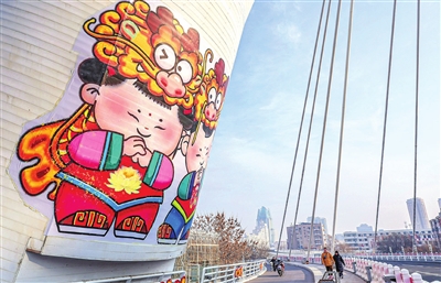 海河上多座桥梁被中国结、灯笼以及巨幅年画装扮一新,一抹亮丽的“中国红”营造出浓厚的节日氛围。