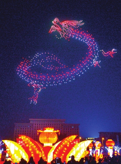 武清区举行无人机灯光秀表演,千余架无人机在夜空中组合成龙的图案,浓浓的节日喜庆气氛吸引了5万余名市民前来观看。