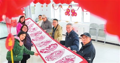 河北区王串场街容彩里社区“彩”剪社的成员,展示剪纸作品“九龙图”,喜迎龙年春节的到来。