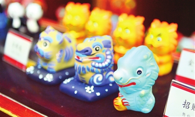 天津古文化街泥人张店内陈列的龙年元素泥塑作品,小龙造型萌趣可爱,吸引了众多游客前来采购。