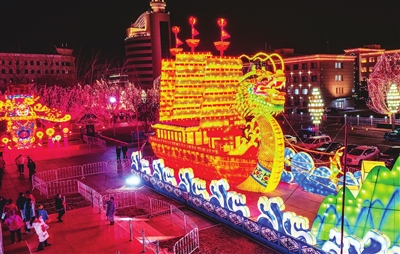 西青区第27届杨柳青国潮灯展上龙船造型灯组美轮美奂,花灯点缀下的杨柳青古镇流光溢彩。