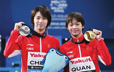 本报讯(记者 李蓓)北京时间昨天凌晨,在卡塔尔首都多哈进行的2024年游泳世锦赛跳水项目焦点战中,中国选手全红婵战胜队友陈芋汐,职业生涯首次在世锦赛摘得女子单人10米台金牌。在花样游泳赛场,中国队在女子双人技术自选和男子单人技术自选两场决赛均收获金牌。
