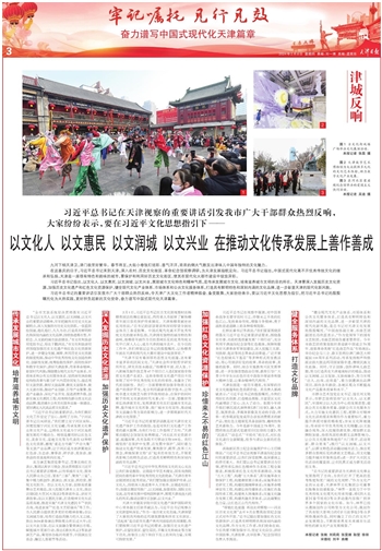 习近平总书记指出,以文化人、以文惠民、以文润城、以文兴业,展现城市文化特色和精神气质,是传承发展城市文化、培育滋养城市文明的目的所在。天津要深入发掘历史文化资源,加强历史文化遗产和红色文化资源保护,健全现代文化产业体系、市场体系和公共文化服务体系,打造具有鲜明特色和深刻内涵的文化品牌,进一步彰显天津的现代化新风貌。