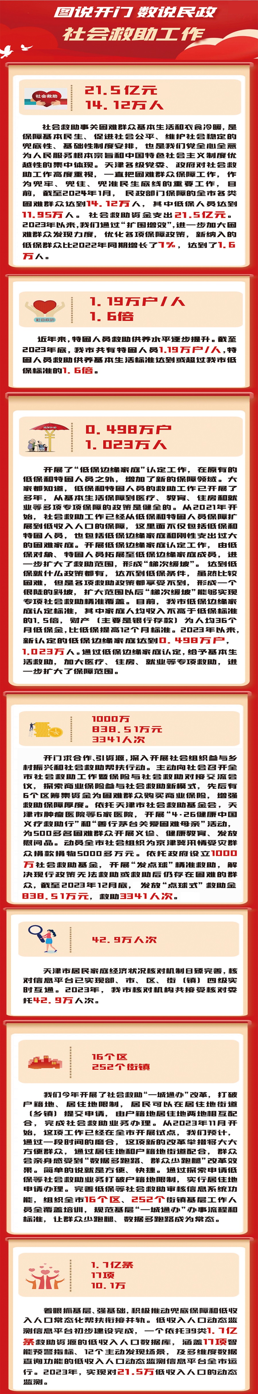 社会参与社会救助积极性进一步增强。召开全市社会救助工作暨保险与社会救助对接交流会议,探索建立商业保险参与社会救助新模式,6个区通过筹措资金,为低保等困难群体购买商业保险,有力增加了救助保障厚度。依托天津市社会救助基金会,会同天津市肿瘤医院等6家医疗机构,开展“4·26健康中国义疗救助行”义诊活动,为500多名困难群众开展义诊和医疗健康教育。举办“5·12善行茅台关爱困难母亲”的母亲节慰问活动 ,为困境母亲发放15万元慰问品。依托政府设立1000万社会救助基金,继续开展“发点球”精准救助,重点解决现行政策无法救助或救助后仍存在基本生活、医疗等困难,截至2023年12月底,发放“点球式”救助金838.51万元,救助3341人次。
