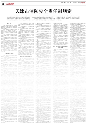 【编者按】 2020年1月《天津市消防安全责任制规定》(以下简称《规定》)在我市正式颁布实施。《规定》共分八章六十七条,从明确消防安全责任制总体原则、细化各级政府部门组织消防工作职责、界定单位消防安全主体责任、完善督促检查考评机制和加大违法违章责任追究5个方面做了细化和规范,以清单形式明晰市、区、街(镇)3级政府,38个部门组织和具有公共服务职能单位以及社会单位的消防安全职责。