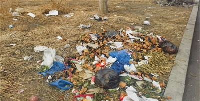 2月1日上午10点30分,记者来到位于外环东路上的兴耀批发市场,发现靠近市场一侧的绿化带内卫生堪忧,草地上散落着各式各样的水果皮、塑料袋、塑料盒等垃圾,一些树上还挂着颜色各异的垃圾袋,从远处看去还以为是装饰用的“彩灯”,绵延百米。
