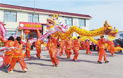 昨日,北辰区小淀镇刘安庄村举行舞龙、高跷、秧歌等民俗表演,吸引众多村民观看。图为女子舞龙队表演。 本报记者 孙立伟 摄