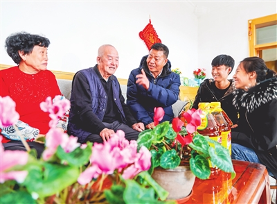 春节期间,郝庆水(右三)带领张墨妍(右一)、郝俊钢(右二)入户发放新春福利。 本报记者 潘立峰 摄