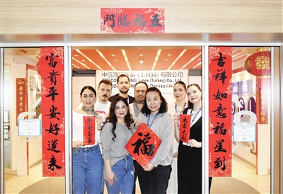 第78届联合国大会协商一致通过决议,将春节(农历新年)确定为联合国假日。中东地区“一带一路”合作项目上的中外员工一起包饺子、贴对联、举办新春联欢会,热热闹闹地庆祝中国龙年春节的到来。图为2月9日,在土耳其伊斯坦布尔,中远海运集运(土耳其)有限公司员工贺岁迎新春。新华社发