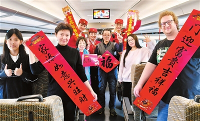 津兴城际铁路通车后的首个春节,乘务组人员与旅客在列车上共同迎接新春佳节的到来。 本报记者 张磊 摄