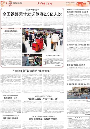 新华社北京2月15日电(记者 樊曦)记者从中国国家铁路集团有限公司获悉,1月26日至2月14日,春运40天时间过半,前20天全国铁路累计发送旅客2.3亿人次,运输安全平稳有序。