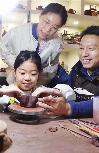 2月16日,游客在江苏宜兴蜀山老街一家DIY紫砂陶艺体验馆制作紫砂雕塑。