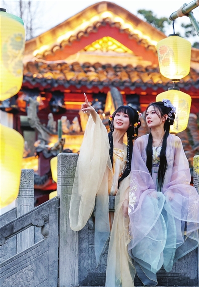 2月13日,两名穿着传统服饰的游客在湖北襄阳米公祠景区新春游园会游玩。