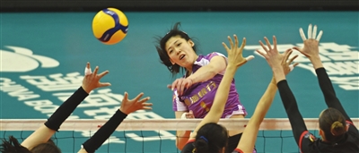 赛场上,李盈莹在大力扣球。