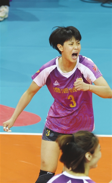 小将刘美君在决赛中一记重扣得分后呐喊鼓劲。