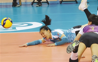 对阵上海队,自由人刘立文飞身救球。