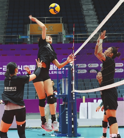 天津女排为联赛备战训练。