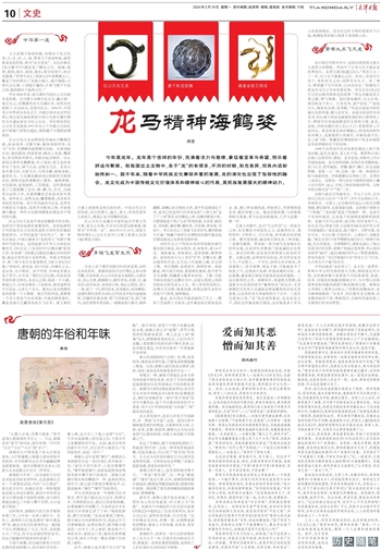 中华民族是“龙的传人”。龙文化一直贯穿、影响中华文明发展的悠久历程,特别是近代中国,龙的精神集中体现在中华民族爱国、奋进、抗争、自强的民族解放精神之中,为中国人民取得革命胜利提供源源不断的精神力量。唐朝诗人李郢《上裴晋公》诗云:“四朝忧国鬓如丝,龙马精神海鹤姿。”在龙年,我们要有龙马精神,有龙腾虎跃的干劲,勇毅笃行,在新时代新征程上实现我们的共同梦想。