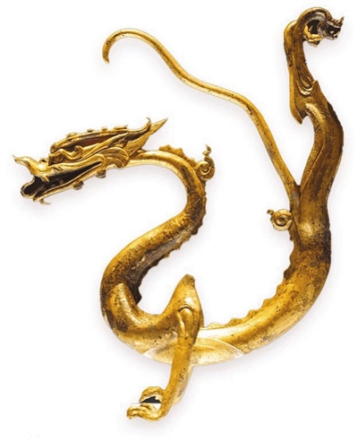 1975年出土于西安市南郊草场坡的唐代鎏金铁芯铜龙,高34厘米,长28厘米,重2.8千克。通体鎏金,身体细长,造型流畅,颇具神韵。高昂的龙头与上身呈“S”形,龙嘴大张,露出锐利的牙齿,长舌在口内卷曲上翘,舌尖顶上颚。双目圆睁,直视前方,炯炯有神。前肢蹬直,两只前爪弯曲,紧紧抓住地面,肢爪骨节尤为清晰,隐藏着力量带来的美。下腹、后肢与细长的尾巴还飘在空中,龙尾从高高上扬的后肢处反折向龙头上方。背上带有两朵祥云,仿佛从天而降,极富动感,体现出唐代龙的生动美与气势美,堪称精品。