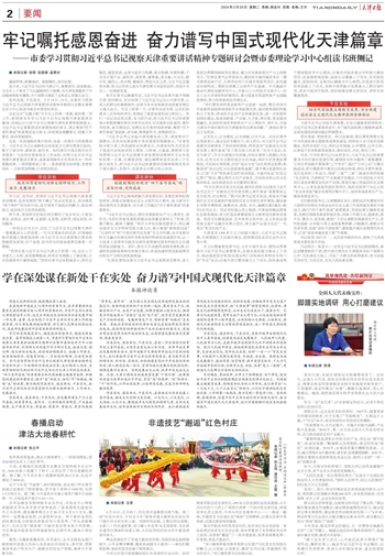 和平区委书记姚建军说,习近平总书记在春节前夕视察天津、慰问群众,充分体现了习近平总书记关心天津发展、心系人民群众的真挚情怀,必将为我市加快推进高质量发展注入强大动力。节后上班第一天,市委举办读书班,让我们深感肩上沉甸甸的责任,更增添了感恩奋进的动力和信心。我们一定以坚定的态度、有力的行动,把习近平总书记的重要指示和殷殷嘱托转化为和平区的扎实实践和实际成效,靠作风吃饭,拿实绩说话,发挥区位优势和资源禀赋,聚焦“四个善作善成”谋创新、求突破,展现新作为、体现新担当。