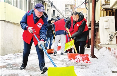 昨日,和平区劝业场街道组织党员、志愿者深入社区清雪,保居民出行。