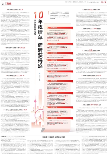 京津“双城记”谱写新篇章。两市全面拓展合作广度深度,协同发展主引擎作用更加凸显。北京创新资源与天津先进制造研发优势深入对接。天开高教科创园注册企业1300余家,吸引天开智算等一批项目成果落地。智慧互通等北京企业在天津建设中试服务平台和生产研发基地,天津120余家汽车零部件企业为北京整车厂商配套。开通天津港至北京大红门及平谷等海铁联运班列,依托京津物流园提供“从港口到餐桌”便利化服务。滨海新区建成航空航天等8个国家新型工业化产业示范基地,形成绿色石化等4个千亿级产业集群,融资租赁资产规模和商业保理资产规模居全国前列。