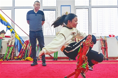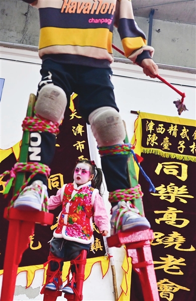 与此同时,我市西青区陈台子村的同乐高跷老会队员们也在为春节期间的花会表演忙碌着。作为区级非物质文化遗产,同乐高跷老会流传至今已经有120余年的历史。传承人陈宝顺表示,元旦过后队员们就开始忙碌起来,准备春节期间的一场场演出。队员们并不是专业演员,他们利用业余时间进行苦练,平日都有自己的工作和学习,一有空闲就聚集到一起练功、彩排。虽然条件简陋,但丝毫没有影响他们对这项传统文化的热情。随着知名度越来越高,许多人慕名而来想加入高跷的队伍中。陈台子同乐高跷老会也开始不断吸收“新鲜血液”,并打破了传男不传女、只传本村不传外村的旧例。