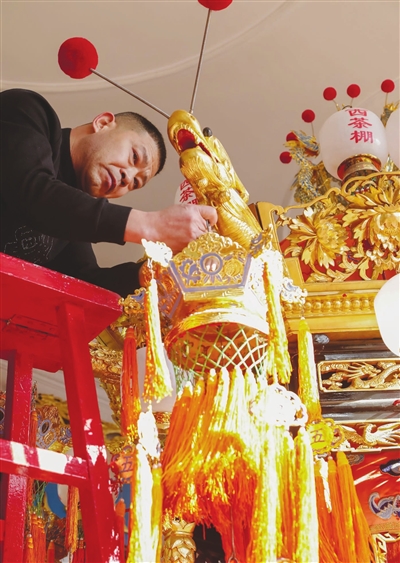 葛沽宝辇会作为国家级非物质文化遗产之一,是天津特有传承几百年的民间花会。每逢农历正月,葛沽民间花会活动进入高潮,多姿多彩的“宝辇”及各类花会队伍灯火辉煌,鼓乐齐鸣,在涌动的人群簇拥下轮番表演,成为人们庆贺太平、祈求吉祥的一项重大活动。葛沽宝辇会八辇四亭之一的西茶棚,其第六代传承人杜云明和他的伙伴们进入腊月开始,就对凤辇进行养护修缮,为即将到来的正月十六葛沽宝辇会做好准备。