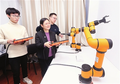 穆朝絮(中)指导学生进行协同机器人研究。 本报记者 姜宝成 摄