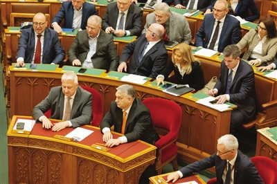 图为2月26日,在匈牙利布达佩斯,国会议员对关于瑞典加入北约议定书的议案投票。 新华社发